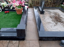 Завершающим этапом стала сборка оградки и укладка брусчатки. Ограждение мы создали из находившихся на могиле секций, кое где закрепив отломавшиеся навершия на разделительные столбики. Перед памятником мы установили гранитный цветник и две траурные урны, а по правую сторону от входа поставили заказанную клиентом лавочку, тоже изготовленную из чёрного гранита. Брусчатку мы замыли водой, одновременно удаляя всю строительную пыль, образовавшуюся в процессе работы.